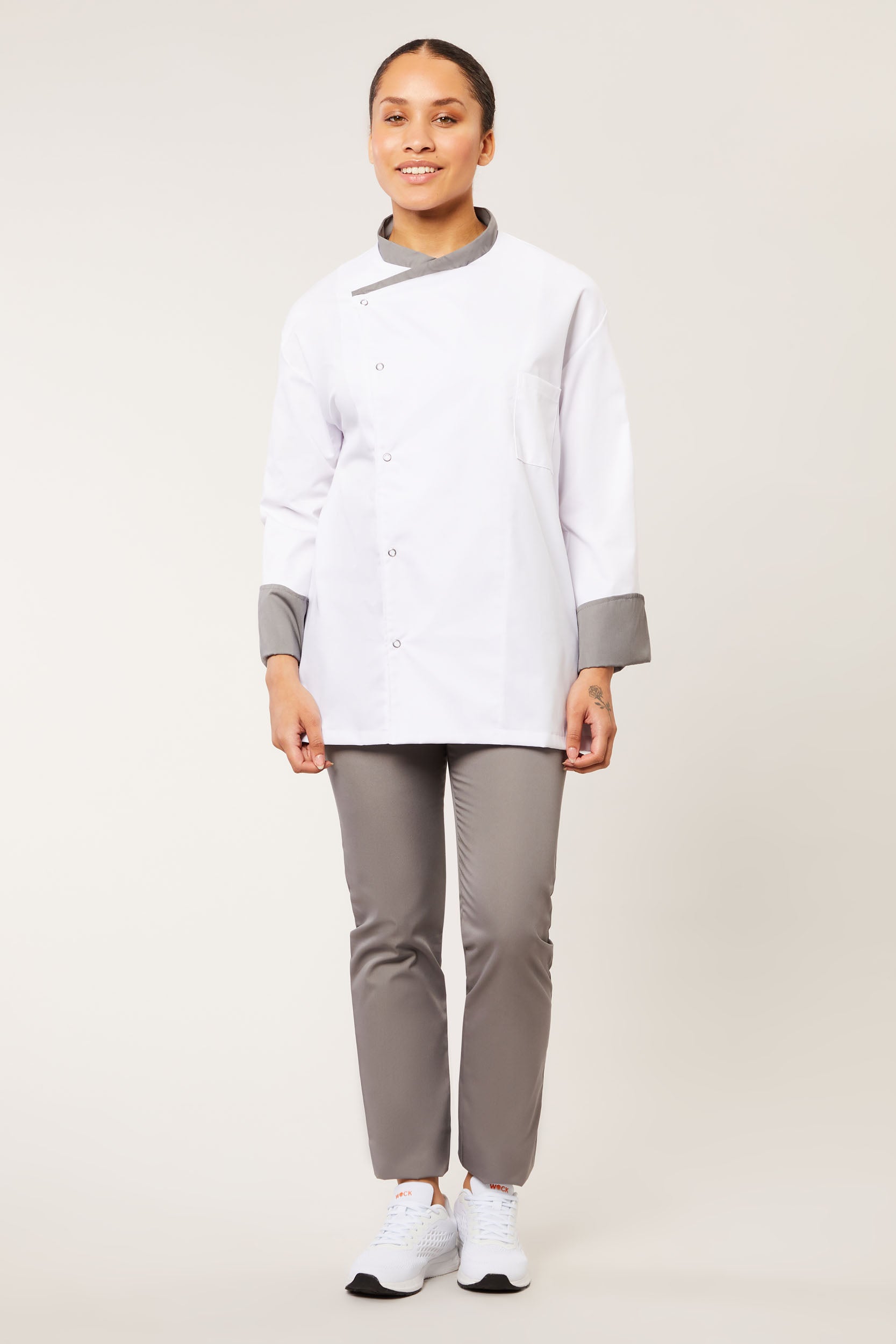 Unisex Lab Coat, 65% Cotton, 35% Cotton. - Long Sleeve; - Gray Sleeve and Collar Detail; - Snap Fastening.