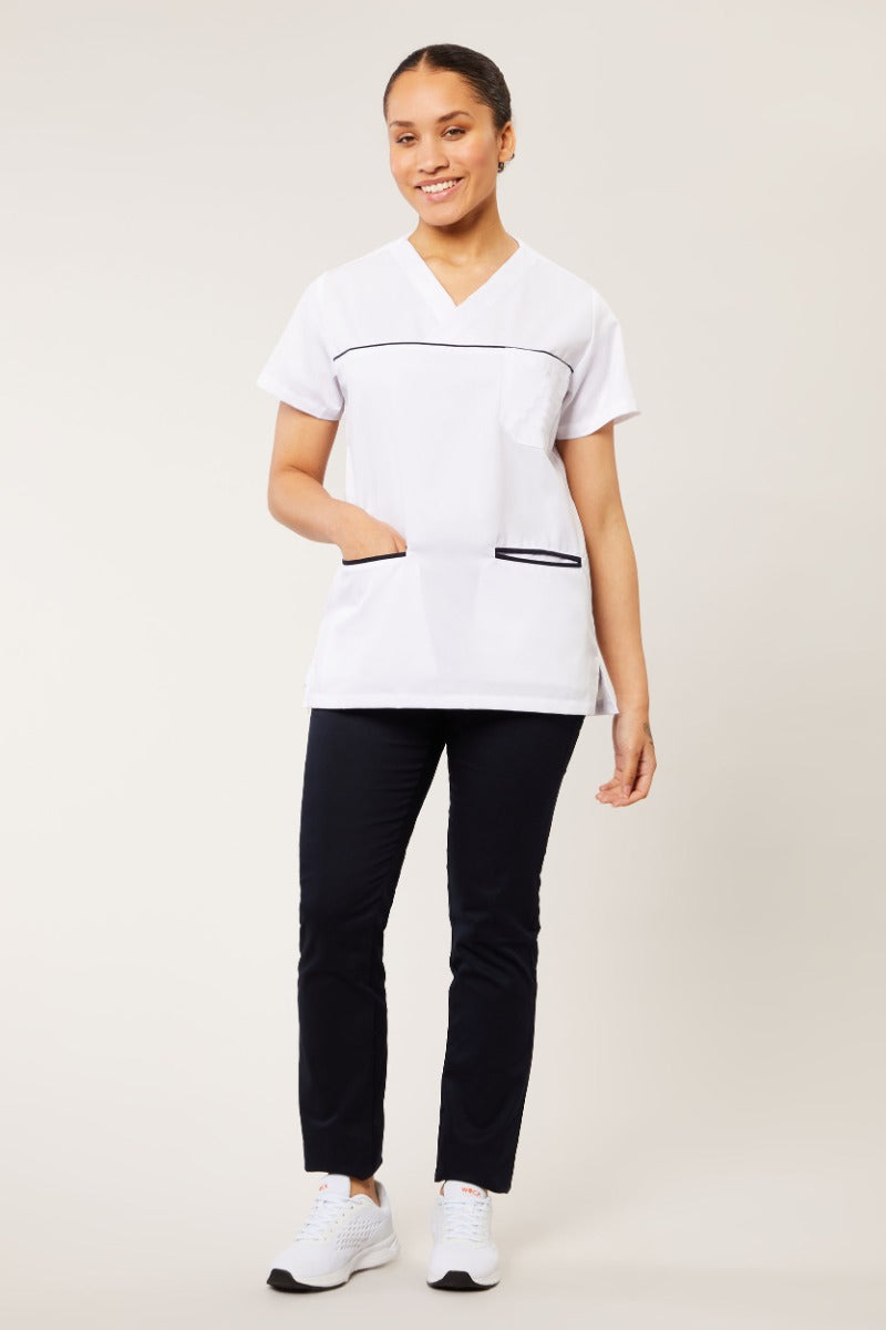 White Twill Tunic, 35% Cotton, 65% Polyester. - Front crossover; - 2 lower pockets with Dark Blue piping and 1 small chest pocket.