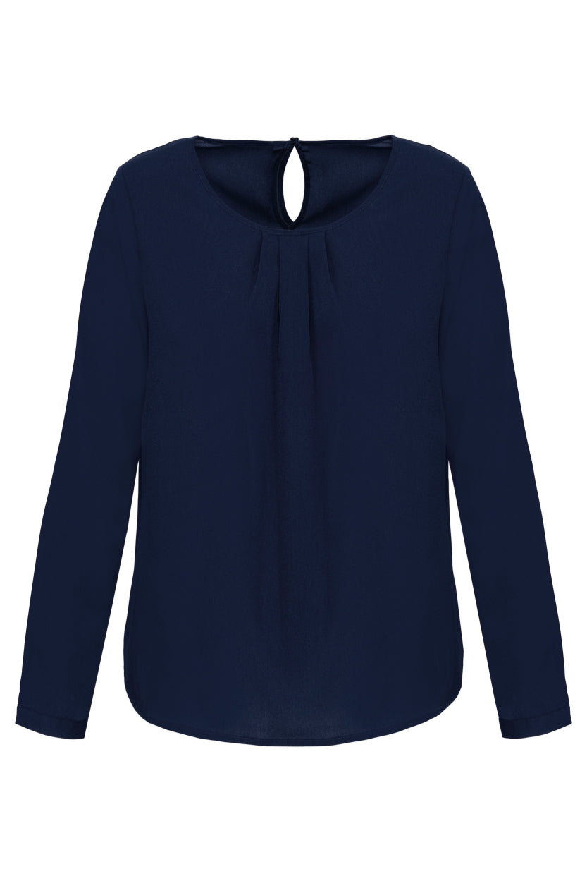 Women's Long Sleeve Blouse, 100% Polyester. - Crepe fabric, light and fluid; - Round neckline; - Small gathers on the neckline; - Color-coated buttons on the sleeves; - Closure at the back and at the bottom of the sleeves with a covered button.