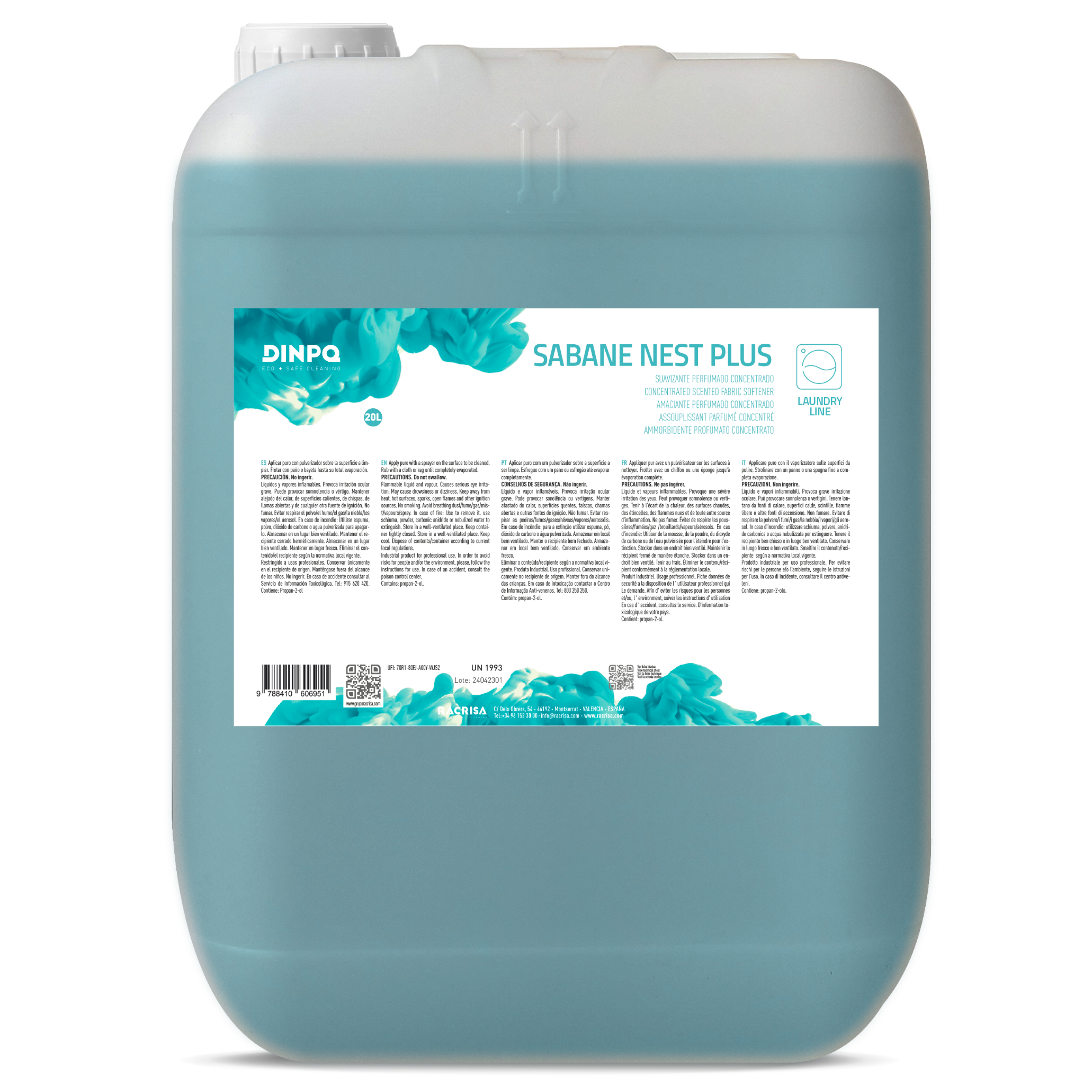 Suavizante concentrado de 20 litros, con perfume azul y tensioactivos catiónicos. Aporta suavidad y frescura a la ropa, ideal para lavados voluminosos.
